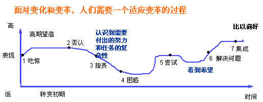 1、吃惊: 拒绝变化,高期望与现实之间的距离 2、否认: 暂时退却,错误的能力匹配