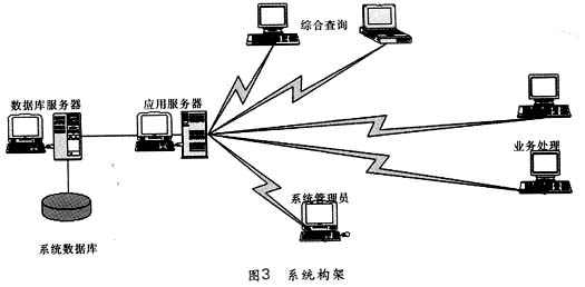 合理的解决方案需要适当的系统架构来实现,系统架构的确定,应该综合考虑系统的安全性、可靠性和可扩展性,同时考虑进行网上交易的可能性,建议系统采用三层架构模式,即:图形用户界面、中间层、数据库分别单独设置。整个系统构架如图3所示。