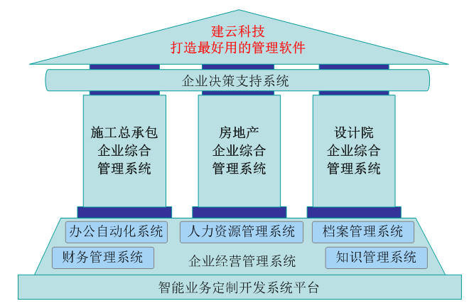 建云科技基于对建设行业工程项目管理以及企业信息化建设的深刻理解和丰富经验,整合企业管理、项目管理、信息技术综合能力,以自主研发的智能业务定制系统平台为基础,以工程项目管理软件为核心,推出企业管理应用、项目管理应用、工程管理应用、信息化技术的一系列解决方案与丰富产品线,以满足建设行业企业的不同需求。