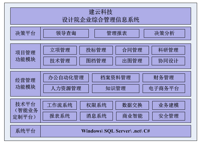 建云科技正是以此为基础来设计实现设计院企业综合管理信息系统,将企业各方面的信息整合起来,建立一个企业员工协同办公的渠道,为各级管理人员提供丰富的项目信息、合同信息、收费情况、业主信息、生产计划、控制及质量等信息资料。通过信息化手段全面提升设计院企业各个管理层次上的管理效率,优化企业工作流、信息流、资金流管理,全面提升企业核心竞争力。